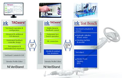 ITK Engineering AG (ITK) has delivered a highly dynamic steering test bench for realistic testing to an Asian automobile manufacturer. It features full automation based on National Instruments (NI) PXI, VeriStand and TACware®, ITK’s software for test bench automation, developed with LabVIEW and LabVIEW Real-Time.