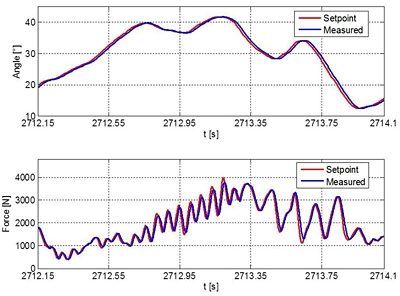 Figure 3 shows a test run with angle and force control under highly dynamic conditions. In this case the control target values came from measurements in a real vehicle, but they can also be calculated online using a simulation model. In that test mode the test bench would be “in-the-Loop”, which means in the same control loop as the steering system and a vehicle model.